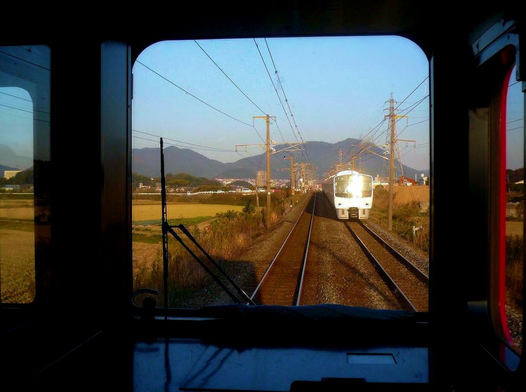 Serie 811 - Begegnungen: Doppelter Gruss - alle an der Zugspitze mitfahrenden Personen sind verpflichtet, gemeinsam dieselben Rufe (z.B. "Ausfahrsignal frei!") und dieselben Handzeichen zu machen; so konzentrieren sich alle gemeinsam auf die Sache. Im Bild: Begrüssung des entgegenkommenden Zugs mit KUHA 810-102 an der Spitze. Takeshita, 28.November 2010. (Aufnahme durch die verglaste Führerstandrückwand) KAGOSHIMA HAUPTLINIE (NORD)