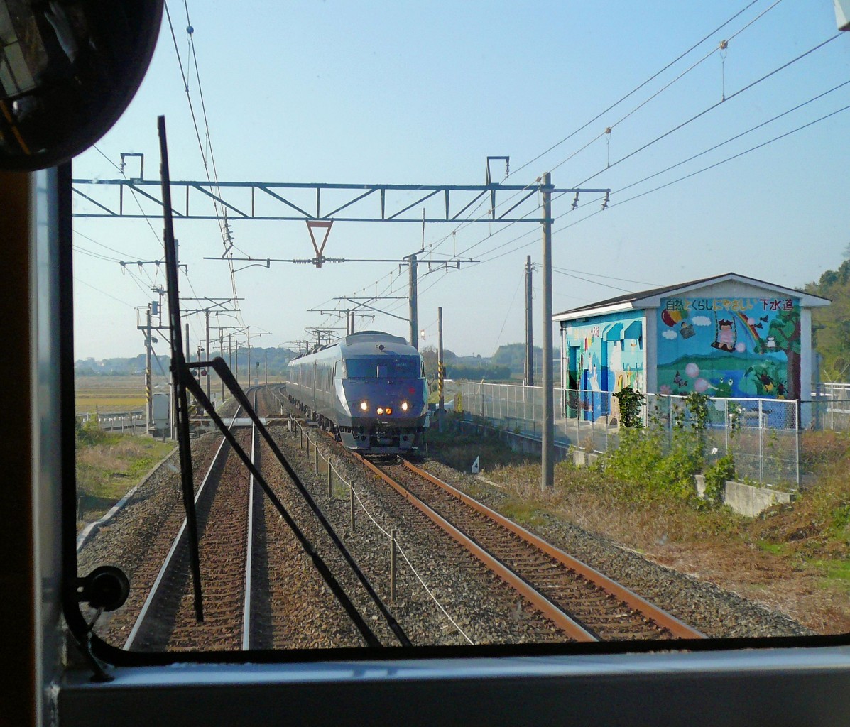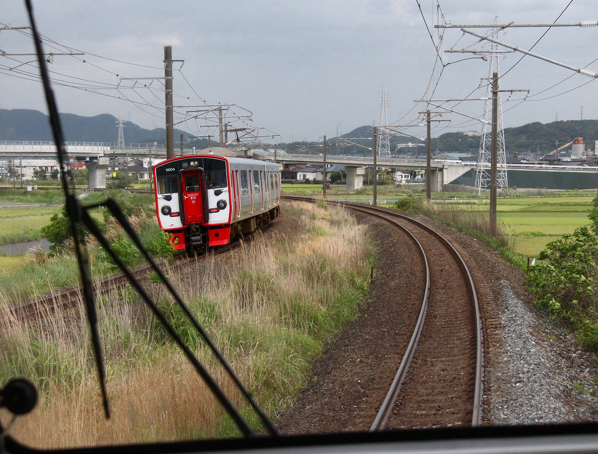 JR Kyûshû Serie 813: Die Wagenführerin, die Zug 813-102 für die Fahrt nach Fukuoka übernimmt, wartet am genau vorgeschriebenen Platz in der Station Ômuta an der Nordwestküste von Kyûshû. Sie kontrolliert dabei die Stirnfront des einfahrenden Zugs. Zu ihrer Ausrüstung gehört neben dem grossen Dienstfahrplan (den sie während der Fahrt mit dem Finger und mit lautem Ausrufen verfolgen wird) auch ein weisser Schirm. 3.Mai 2016