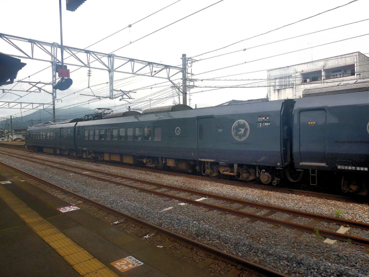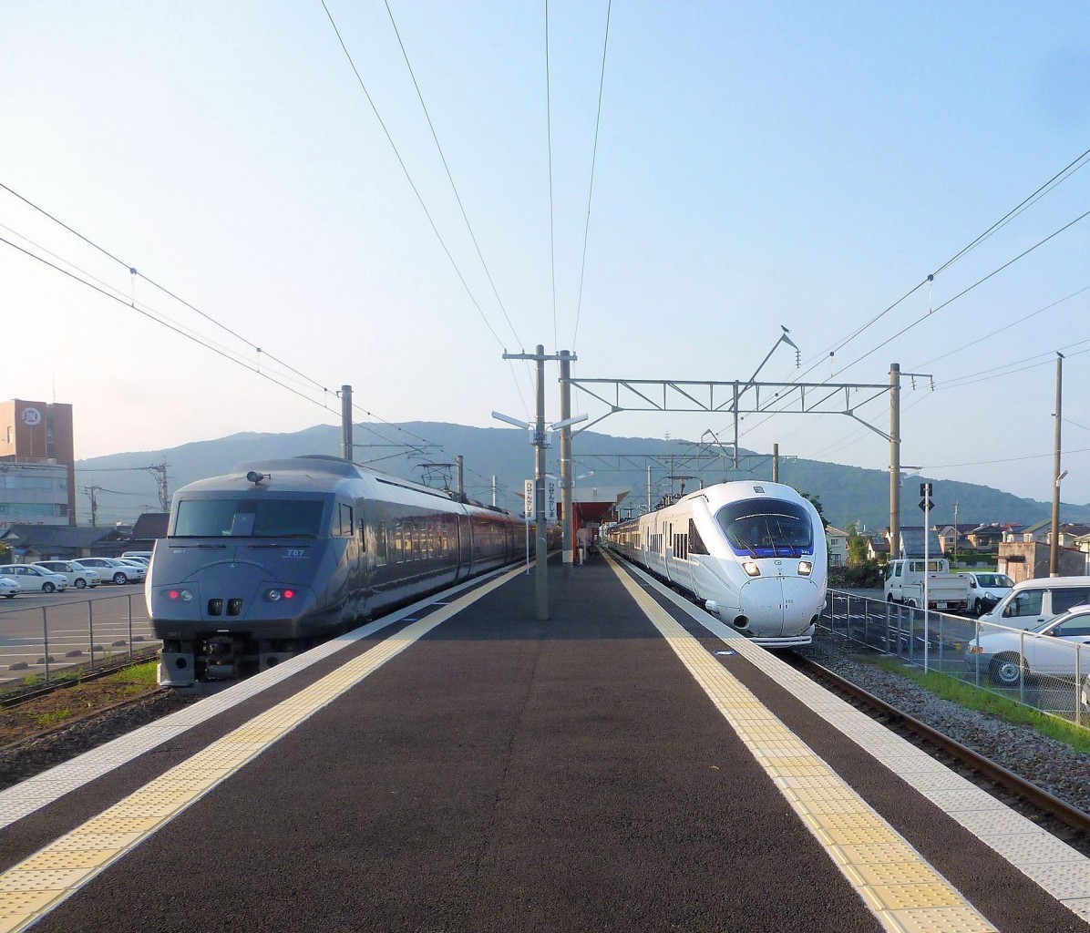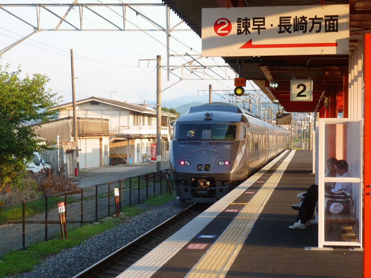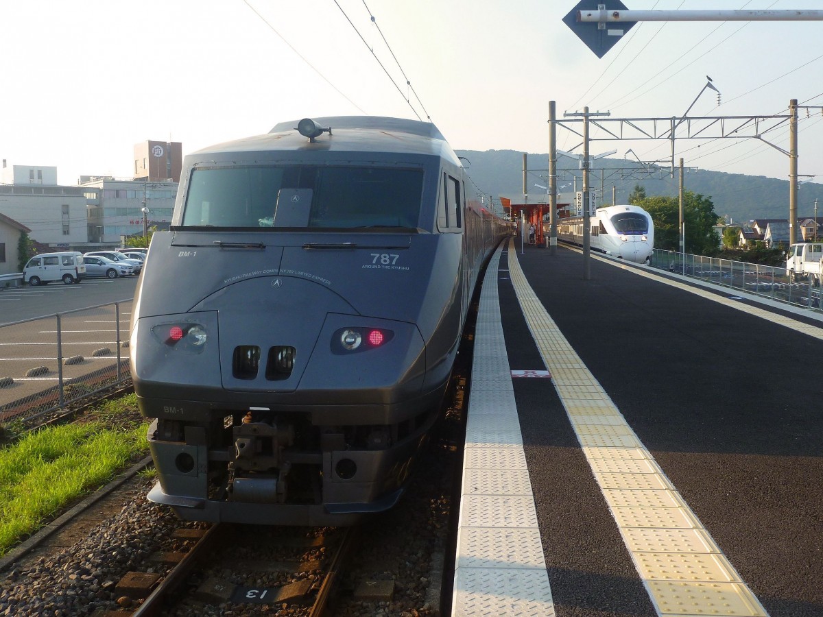 Serie 787: Bei Ônoshimo an der Westküste von Kyûshû begegnet ein 4-Wagenzug, geführt von KUROHA 786-8. Das sicher von den örtlichen Kindern bemalte Haus trägt die Aufschrift "Eine Kanalisationsanlage, die für die Natur und das Leben Gutes tut". 1.Dezember 2010. KAGOSHIMA HAUPTLINIE (NORD)