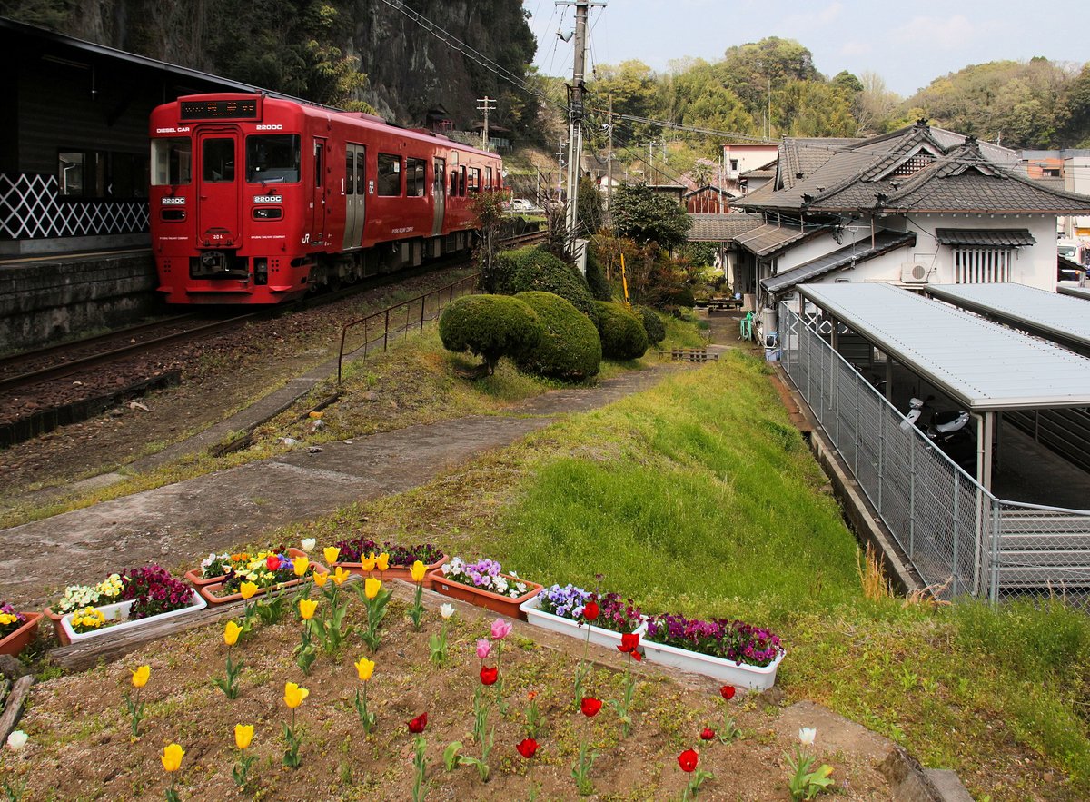 KIHA 220: Wagen KIHA 220-201 in Bungo Nakamura in den Bergen im östlichen Zentral-Kyûshû, 2.Mai 2016. KYÛDAI-HAUPTLINIE