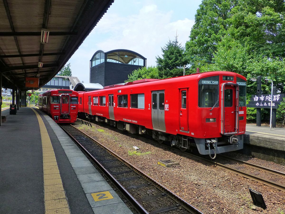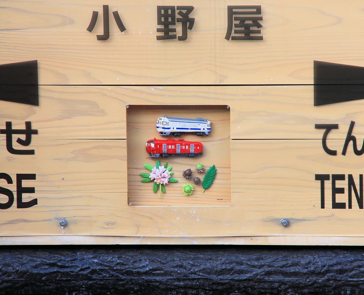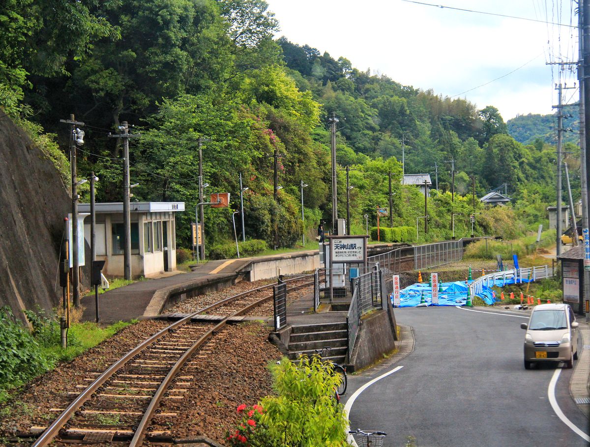 Im Erdbebengebiet von Zentral-Kyûshû: Zweiwagenzug KIHA 200-3 und 200-103 fährt in die schwer beschädigte Ortschaft Onoya ein; die Zerstörung an den Hausdächern ist gut zu sehen. So ein Erdbeben fühlt sich an wie auf einem Trampolin, deshalb sind die Dachschäden besonders gross. 6.Mai 2016. KYÛDAI-HAUPTLINIE