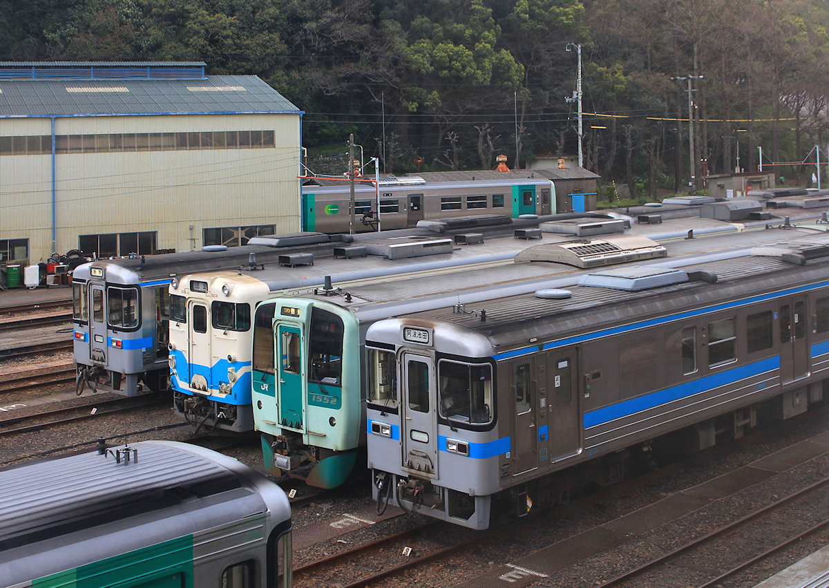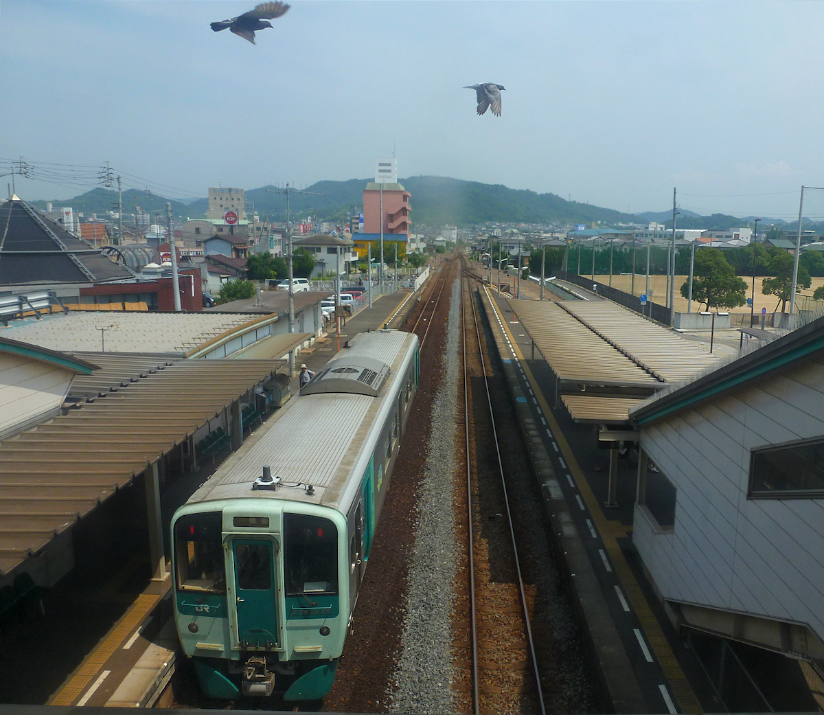 Lokalverkehr auf Shikoku - der Nordosten: Triebwagen Serie 1500 Nr. 1562 in Bandô. Auf dem Bahnsteig ein kleiner Torbogen, der den Eingang in den heiligen Bereich eines Schreins bildet (dieser befindet sich etwas weiter oben am Berghang). 10.August 2013.