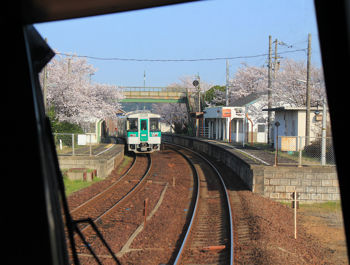 Regionalverkehr im Nordosten der Insel Shikoku - die Hauptverbindung zwischen den Städten Takamatsu und Tokushima: Triebwagen 1558 wartet in Shido einen Gegenzug und die Ueberholung durch einen Intercity-Express ab. 9.August 2013.
