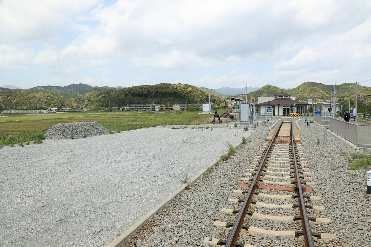 Die Ostküstenlinie der Insel Shikoku aus dem Triebwagen 1509. Der Zug hält an zahlreichen mysteriösen Haltestellen mit grossen Gebirgstempelanlagen, wie hier in Sabase, 3.April 2015.