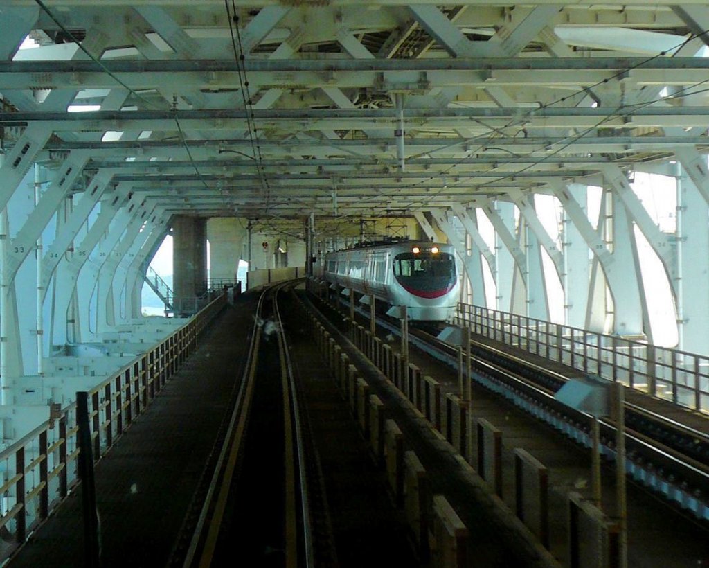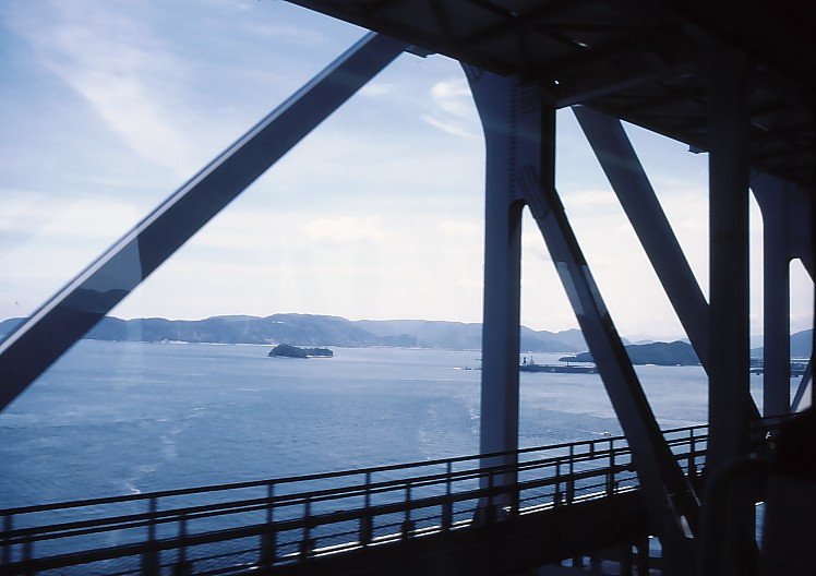 Die Seto Oohashi Linie, das Einsatzgebiet des Steuerwagens KU-RO 212-4 (クロ212-4). Die Linie verbindet seit April 1988 die Stadt Okayama auf der Hauptinsel Honshû mit Takamatsu auf der Insel Shikoku. Die Brücke ist 13,1 km lang, davon sind 9.368 km echte Brücke, der Rest verläuft auf kleinen Inselchen in der Inlandsee. 9.April 2008.
