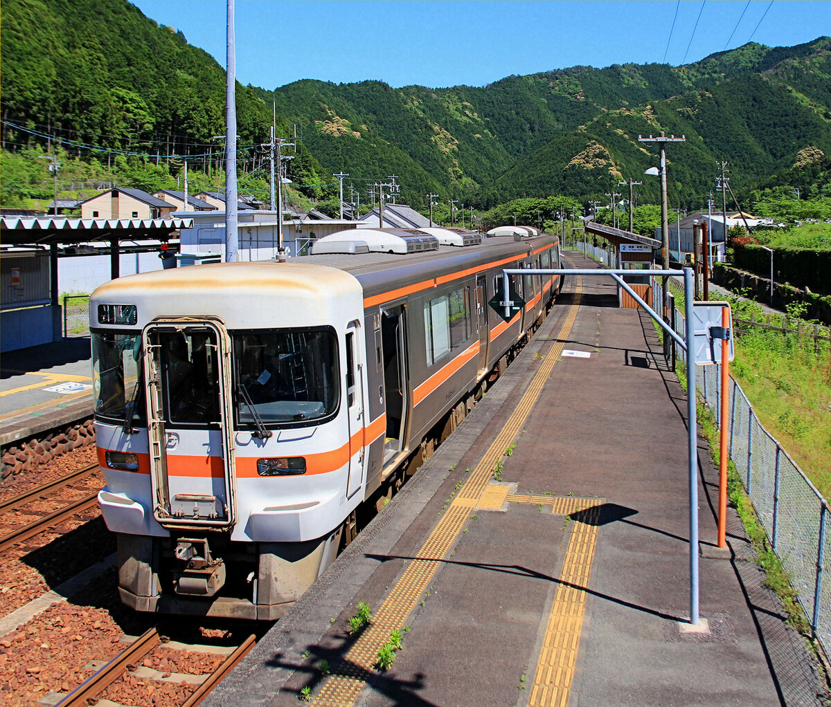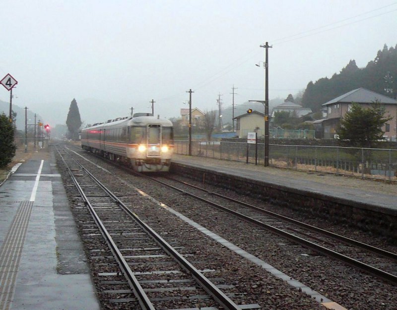 KIHA 85 (キハ85): Die beiden Endwagen dieser Triebwagenzüge sind unsymmetrisch; Richtung Norden haben sie (wie im Bild) Uebergänge, an die Zusatzmodule gefügt werden können. Bild: Durchfahrt eines Zuges in Kata, einer Bucht am Pazifik. 24.Februar 2009.