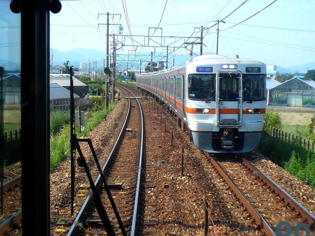 Serie 313 im Hauptbahnhof Nagoya: Ein Zug der besonders bequemen Unterserie 313-8000 für intercity-ähnliche Dienste mit reservierten Sitzplätzen (Baujahr 1999) verlässt den Bahnhof Nagoya. Frontwagen KUHA 312-8001 (クハ312-8001), 26.September 2009.