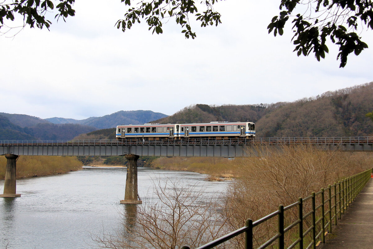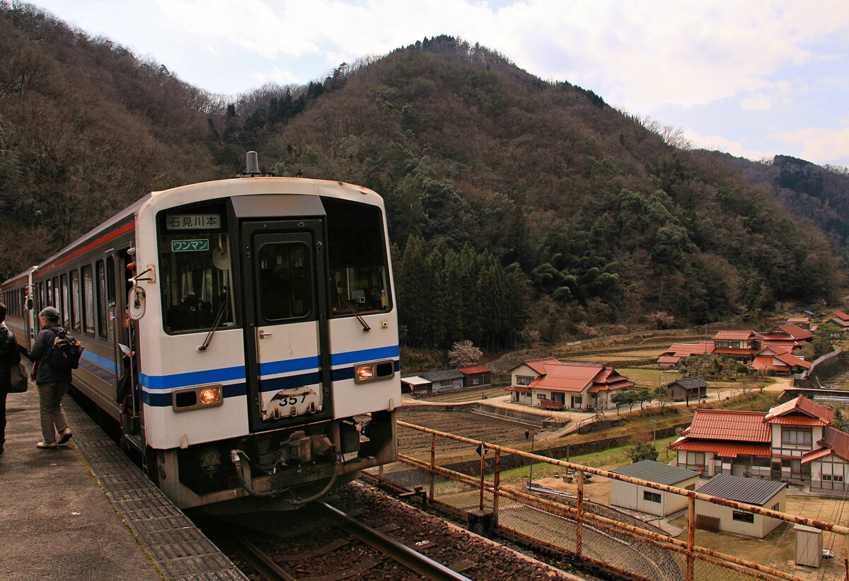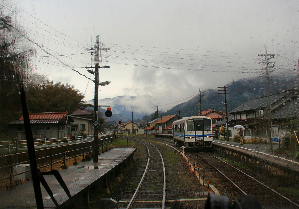 Die KIHA 120 des westjapanischen Hochlandes. Links wartet der KIHA 120-338 auf den Abfahrtsbefehl, rechts ist der KIHA 120-328 soeben angekommen; sein Wagenführer, in schmucker weisser Sommeruniform, begibt sich zum vorderen Führerstand für die Rückfahrt. Tôjô, 30.September 2001.