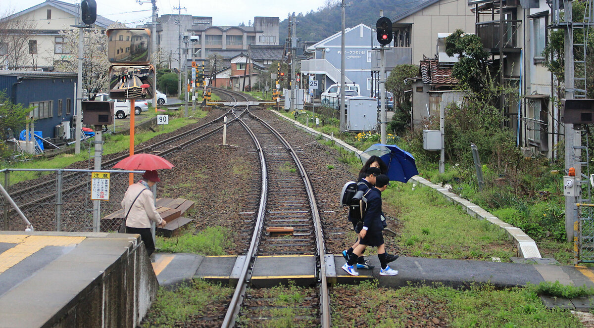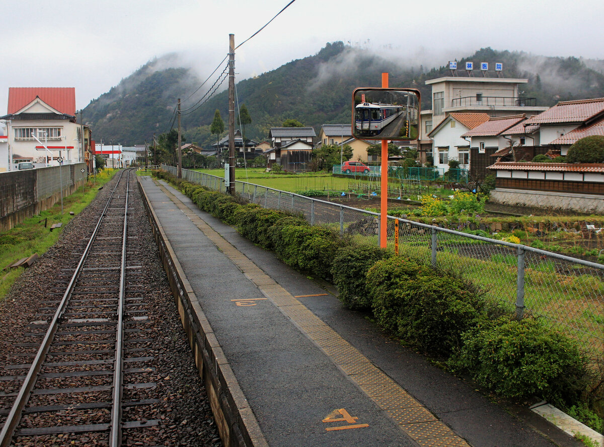 Die Chizu Kyûkô Privatbahn im Spiegel: Schüler sind aus dem Zug ausgestiegen, und der rote Schirm spiegelt sich vor Triebwagen 3504 + 3503 im Bahnsteig-Spiegel. Auf der JR Imbi Linie kurz vor Tottori, in Tsunoi, 6.April 2015. (Aufnahme aus dem frei zugänglichen hinteren Fenster) Peter Ackermann