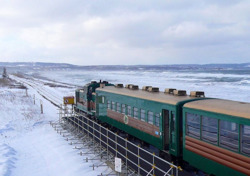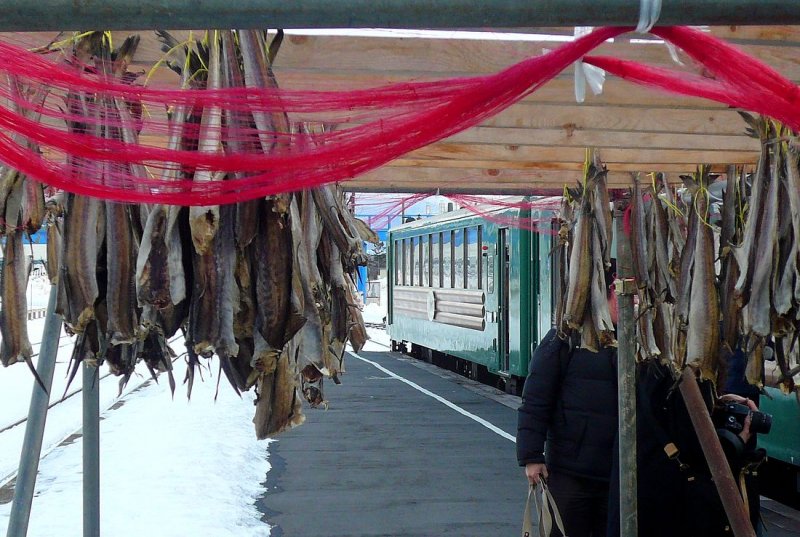 Touristikzug auf der kaum befahrenen Kisuki-Linie: Der Zug ist über eine Spitzkehre hoch oben im Wald Steuerwagen voran nach Izumo Sakane heruntergekommen. Jetzt macht er wieder eine Spitzkehre und wird dann Lok voran weiter in die Ebene hinunterfahren. Links wartet einer der 3 Regelzüge des Tages (Triebwagen KIHA 120-3)auf die Weiterfahrt bergauf. 21.September 2002.