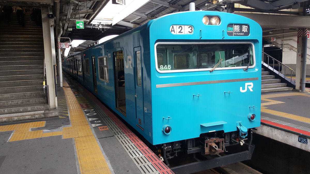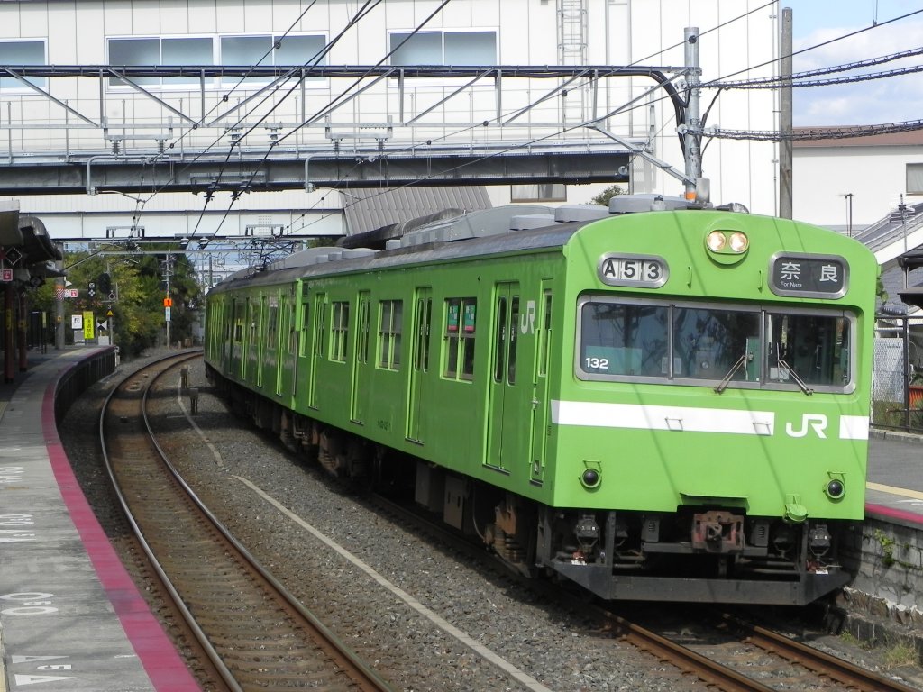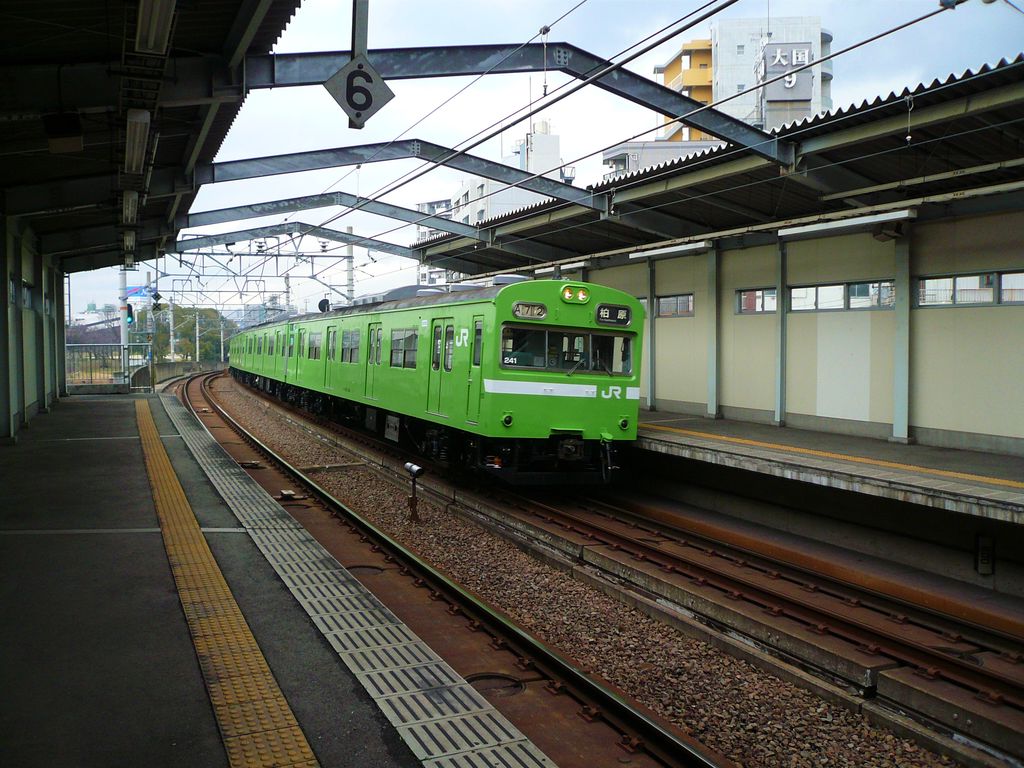 Serie 103: Die Züge der Verbindung Kyoto - Osaka mit Umweg über das kulturelle "Herz" Japans - die aus dem 7./8.Jahrhundert stammende Stadt Nara - benutzt hellgrüne Züge. Hier ist Endwagen KUHA 103-27 in Kyoto-Ôbaku, 4.Oktober 2006.