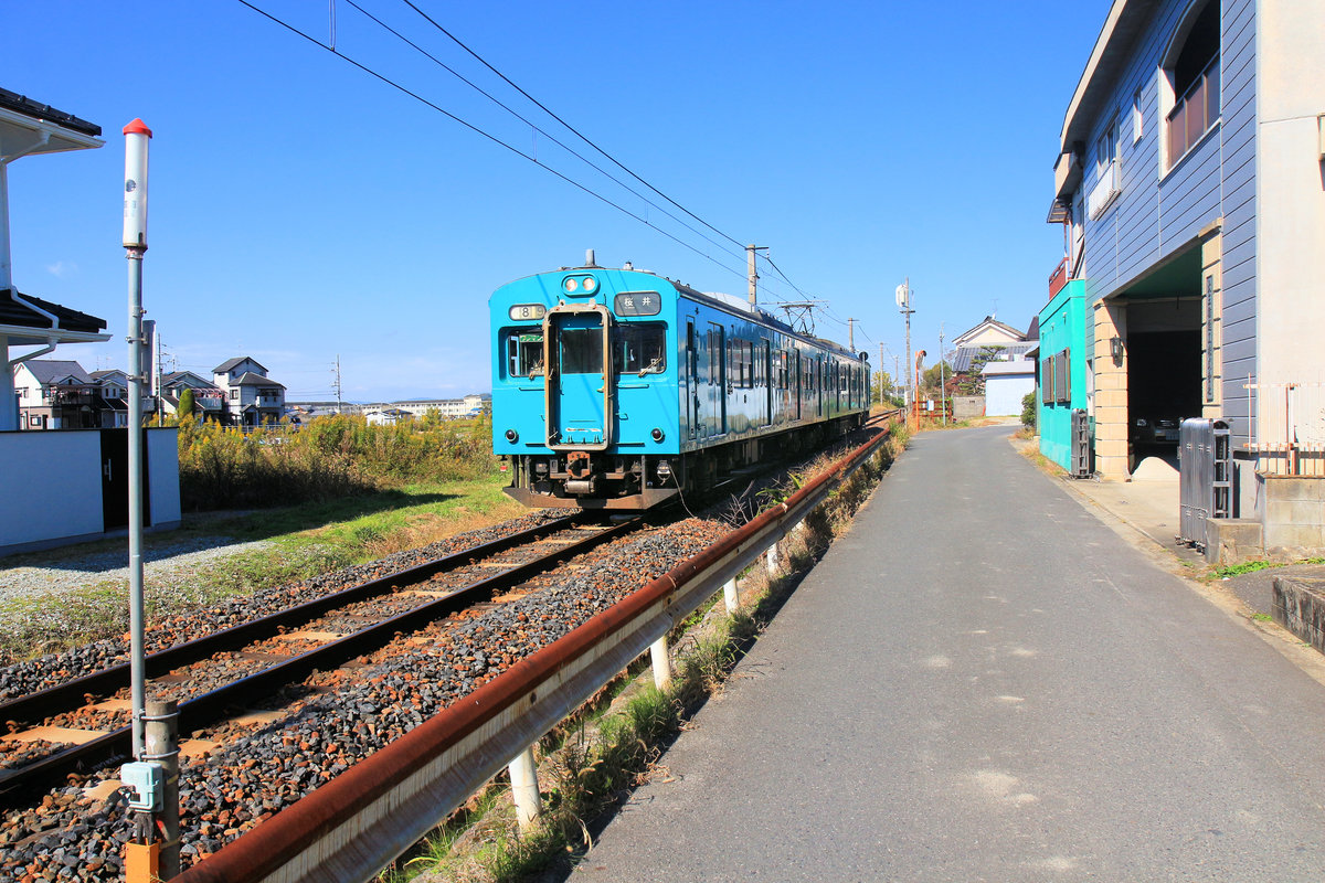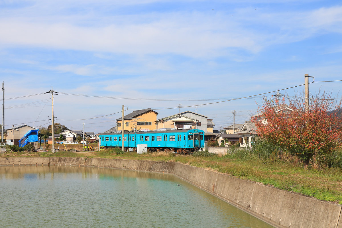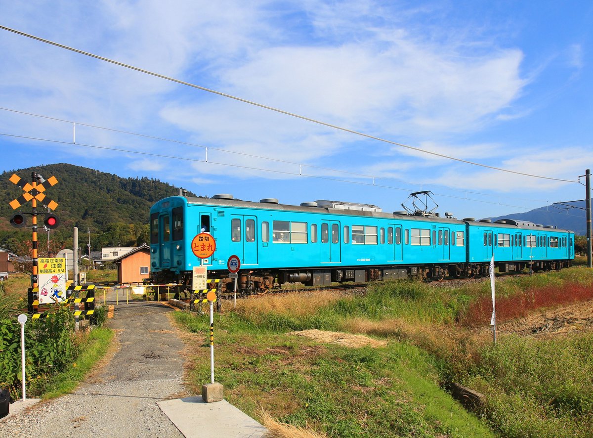 Nur noch wenige Wochen bis zum Einsatzende der alten Züge Serie 105, ehemals Staatsbahn für U-Bahn Tokyo. Zug KUMOHA 105-510 + KUHA 104-510 bei Miwa; beide Wagen sind einstige Mittelwagen mit neu angebautem Führerstand. 7.November 2018