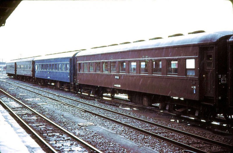 Dieselzüge von JR-Westjapan an der Küste des Japanischen Meeres: Im Frühling Triebwagen KIHA 47 2018 in Hôgi in der Präfektur Tottori. 6.April 2015.
