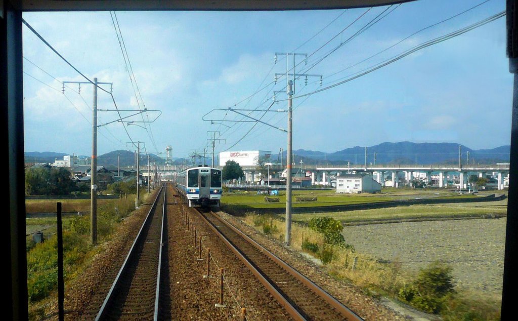 Serie 213: Einer der drei letzten Dreiwagenzüge dieser Serie von JR-West kommt in Tatsuno entgegen, geführt von KUMOHA 213-5. Im Hintergrund ist die Sanyô-Shinkansenlinie nach Westjapan und Kyûshû erkennbar. 26.September 2010. (Aufnahme durch die verglaste Führerstandrückwand eines Gegenzugs) Peter Ackermann