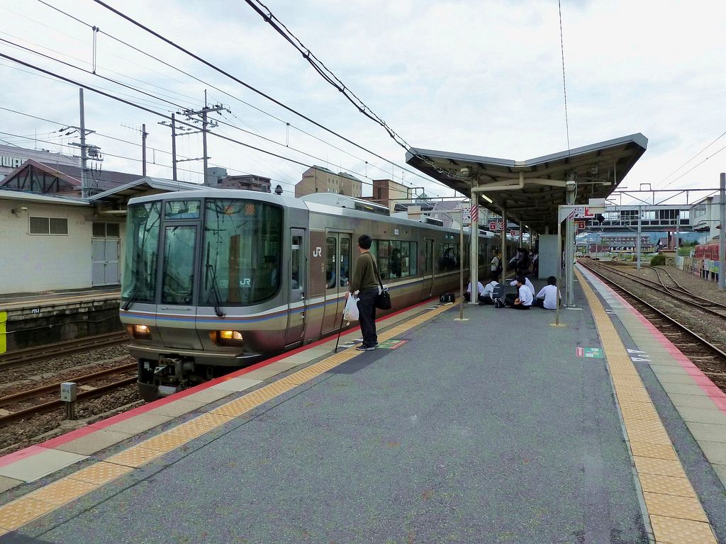 Serie 223: In Ômi Hachiman ist der Zug mit Steuerwagen KUHA 222-2063 eingefahren. Wie man sieht, sind die Böden so sauber, dass sie sich als Sitzfläche eignen... 20.Juni 2011.