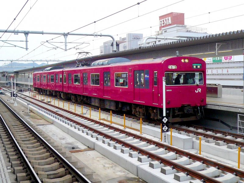 Serie 103: einige dieser klassischen S-Bahnwagen (3503 Wagen, gebaut 1963-1984) sind aus den grossen städtischen Agglomerationen (Tokyo und Kansai) verdrängt und nun in ruhigeren Diensten. Bild: Für die Umgebung der Stadt Himeji wurden 9 Motorwagenpaare 1998 mit Führerstand versehen. Sie bilden nun Zweiwagenzüge; hier ist das Paar KUMOHA 103-3501 mit KUMOHA 102-3501 in Himeji, 28.Februar 2009. Peter Ackermann