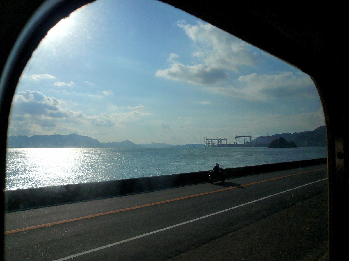 Mit Zügen der Serie 105 der Inlandsee entlang: In der Ferne tauchen die kleinen Schiffswerften auf, die während langer Zeit den wichtigsten Industriezweig der Region bildeten. Aufnahme aus Zug 105-19 bei Saizaki, 6.Dezember 2010. Peter Ackermann