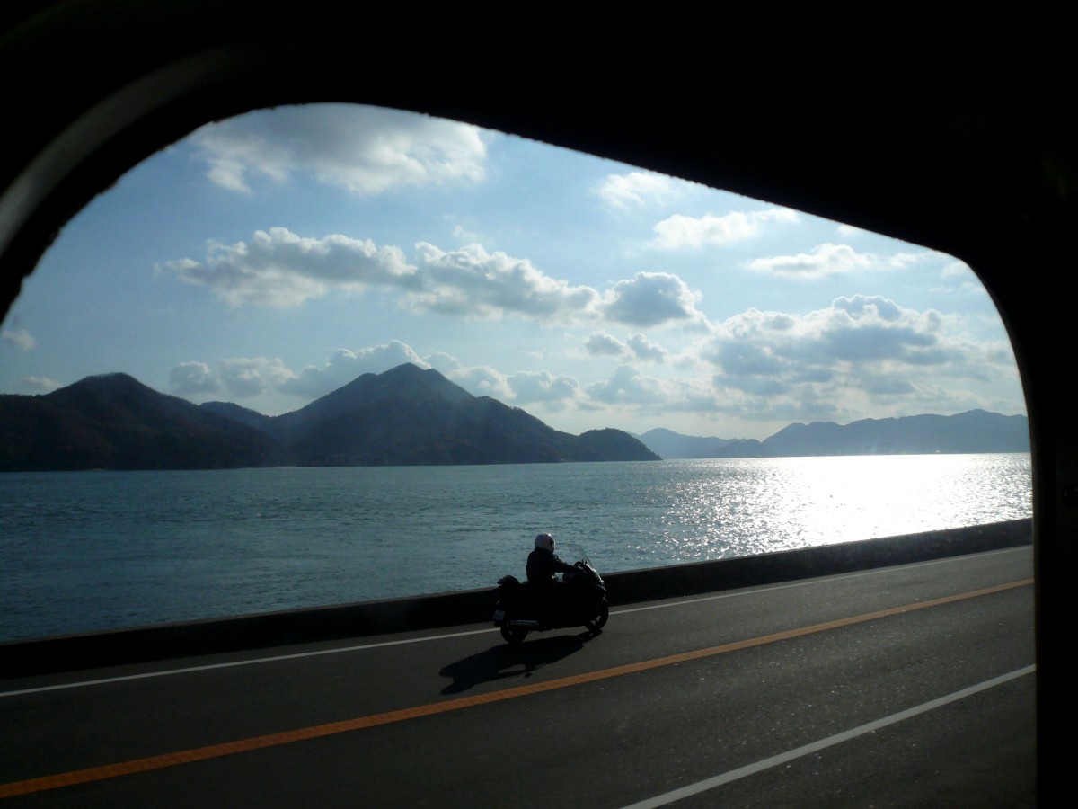 Mit Zügen der Serie 105 der Inlandsee entlang: "Inlandsee" heisst der Teil des Pazifischen Ozeans, der zwischen der japanischen Hauptinsel Honshû und der sich südlich davon erhebenden Insel Shikoku liegt. Der Inlandsee entlang führt die Kure-Linie; Aufnahme bei Saizaki aus dem Zweiwagenzug 105-19, am Wintertag 6.Dezember 2010. Peter Ackermann
