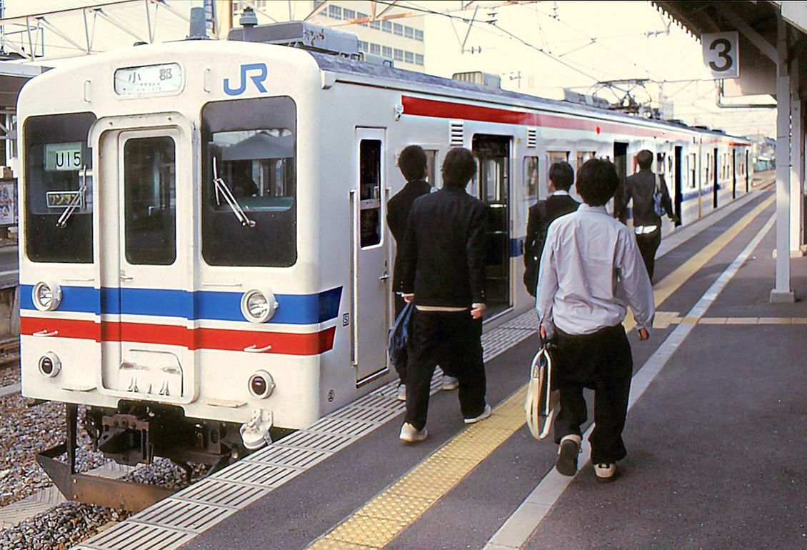 Schülerinnen besteigen die Lokalbahn (bzw. entern die Bahn, denn Einsteigtreppen gibt es in Japan nicht). Und Einzeltriebwagen (hier der alte ehemalige Staatsbahnwagen KUMOHA 123-2) finden sich nur an sehr abgelegenen Orten. In Shin Yamaguchi, 8.Oktober 2015.