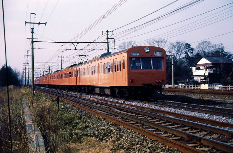 GLEICHSTROMZUEGE: Diese haben die Nummerngruppen 100/200/300 ff. Die Pazifikküste (Tôkaidô) und die Grossagglomerationen (Tokyo-Nagoya-Kansai,d.h.die Städte Kyoto,Osaka,Kobe)sind längst mit Gleichstrom 1500V elektrifiziert.Die 1957 gebauten Züge Serie 101, erstmals mit Kardanwellen-Antrieb und Verteilung der Apparate auf verschiedene Wagen, läuten ein neues Zeitalter ein. Erstmals auch Anstrich für jede Linie unterschiedlich. 1535 Wagen Serie 101 gebaut; im Einsatz bis 2003.Hier ist - noch ohne Klimaanlage - ein Zug Serie 101 (Frontwagen KUHA 101-22) in Tokyo-Higashi Koganei; Anstrich orange für die Chûô-Linie. 5.November 1972.