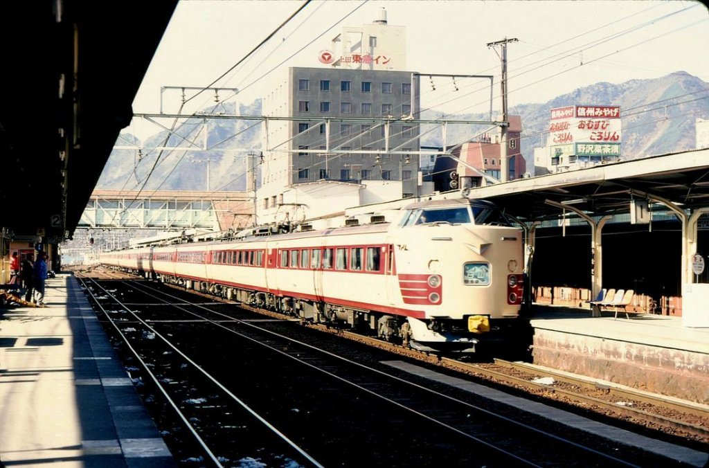 Serie 489 (1.Generation): 5 Züge für die Strecke über die Usui-Steilrampe nach Nagano und weiter ans Japanische Meer, gebaut 1971/72. Die 1.Generation hatte noch das Design mit den grossen Vorbauten. Im Bild wird ein Zug mit Frontwagen KUHA 489-4 von den beiden Schiebeloks der Usui-Rampe in den Bahnhof Karuizawa gestossen. 7.Februar 1973.