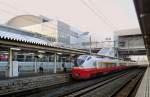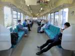 Grunddaten der Serie 701: Wechselstromtriebwagen 20kV/50 Hz. 1993-2002 von JR Ost-Japan als Standardtriebzüge für Nordost-Japan (Tôhoku) gebaut; einfache, robuste Bauweise mit Längssitzen. Weitgehend Zweiwagenzüge (motorisierter KUMOHA クモハ701 + Steuerwagen KUHA クハ700 mit Toilette). 13 Züge haben noch einen unmotorisierten Zwischenwagen (SAHA サハ701), 4 Züge sind Vierwagenzüge. Stirnwandübergänge machen längere Zugsbildungen möglich. Total 103 1067mm-Spurzüge und 19 1435mm-Spurzüge. Bild: Die beiden Zweiwagenzüge 701-30 und 701-24 in der Mittagspause in Hirosaki im äussersten Nordwesten Japans, 1.November 2013.