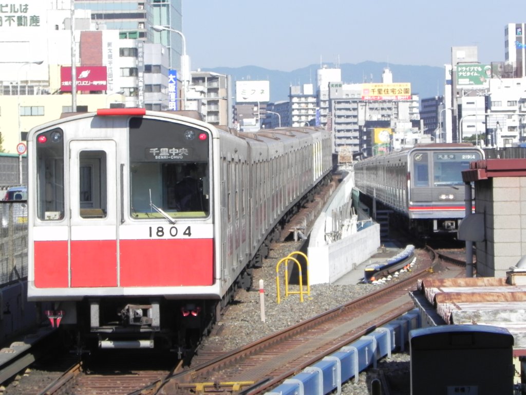 Midōsuji Line Series 10 Zug nach der Ausfahrt aus der Haltestelle Shin-Osaka in Richtung Senri-Chūō. Diese Züge, die seit 1976 in Dienst sind, werden nach und nach von den neueren Series 21 Zügen ersetzt, sind aber noch häufig anzutreffen.