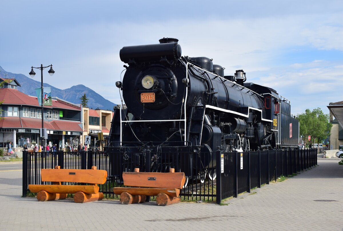 Die 4-8-2 Lokomotive #6015, bekannt als Class U-1-A, ist eine Schnellzuglokomotive der Canadian National. Gebaut 1923 von der Canadian Locomotive Company ist sie seit 1972 in Jasper (Alberta) vor dem Bahnhof ausgestellt. Farbnegativscan Juni 1997