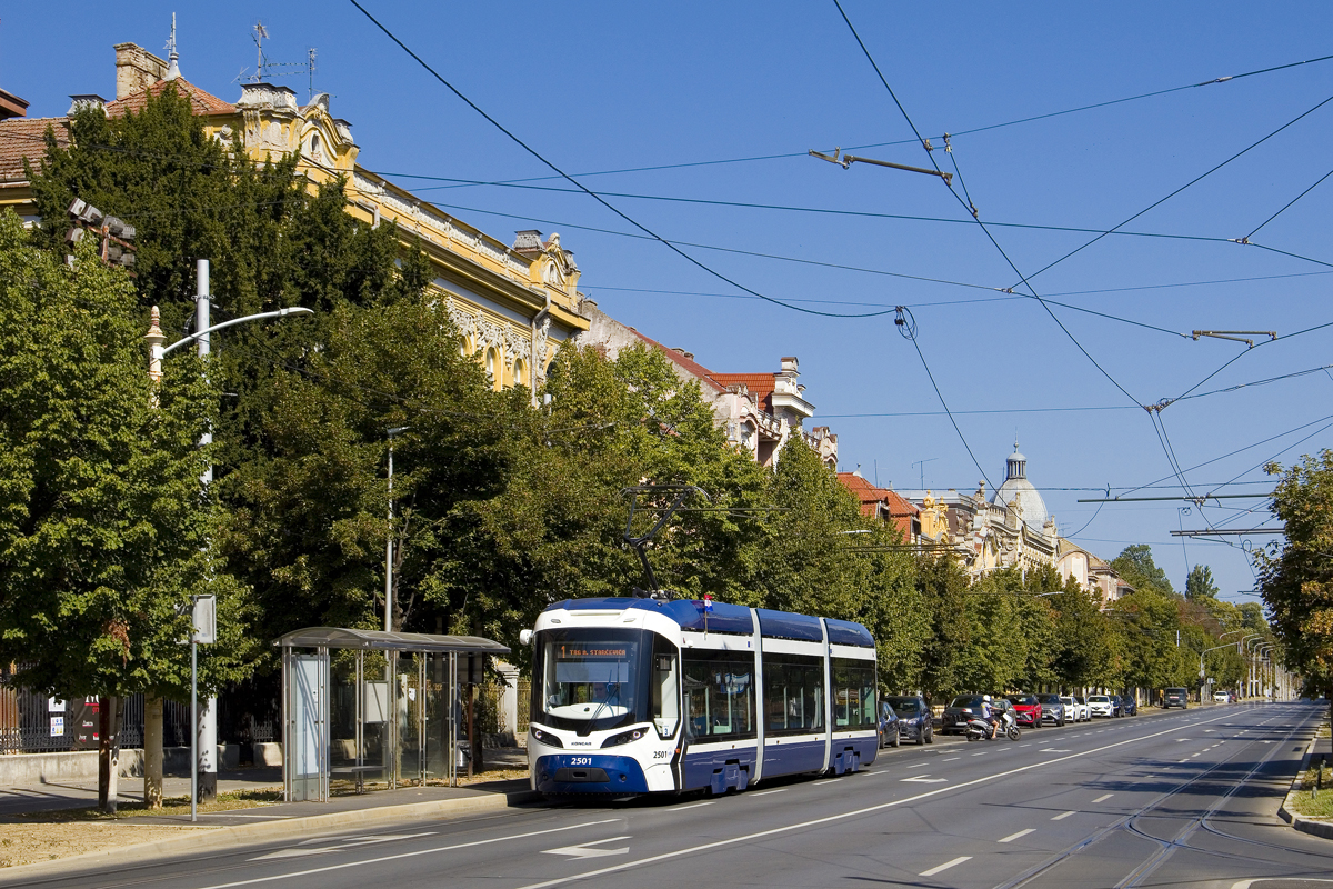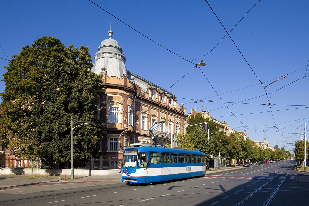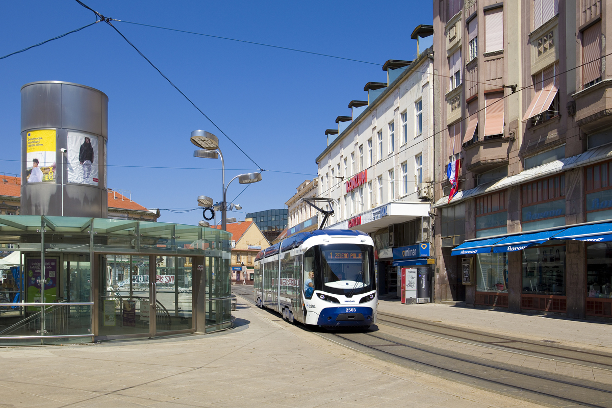 Am 15. August 2025 hat TMK 2500 2503 von Zeleno Polje kommend als Linie 1 die baustellenbedingte Endstation am Trg Ante Starčevića erreicht. Anschließend wendete der Wagen über das Gleisdreieck.