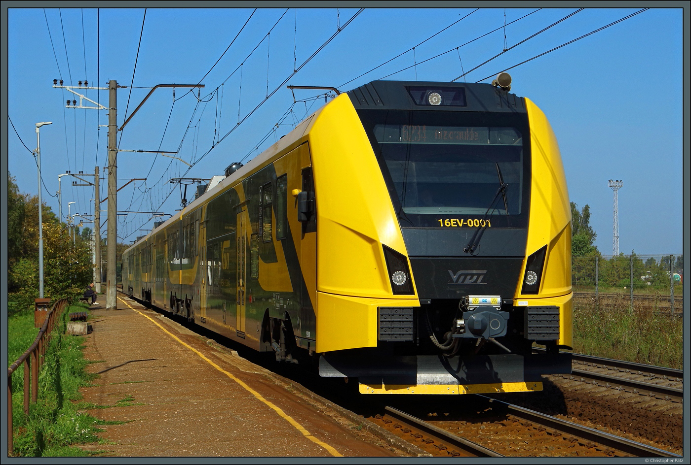 Ein Triebwagen der neuen Baureihe 16Ev nähert sich vor der Kulisse der Rigaer Altstadt dem Hauptbahnhof. Vor dem Zug ist die Trasse für die normalspurige Rail Baltica im Bau. (Riga, 29.08.2024)