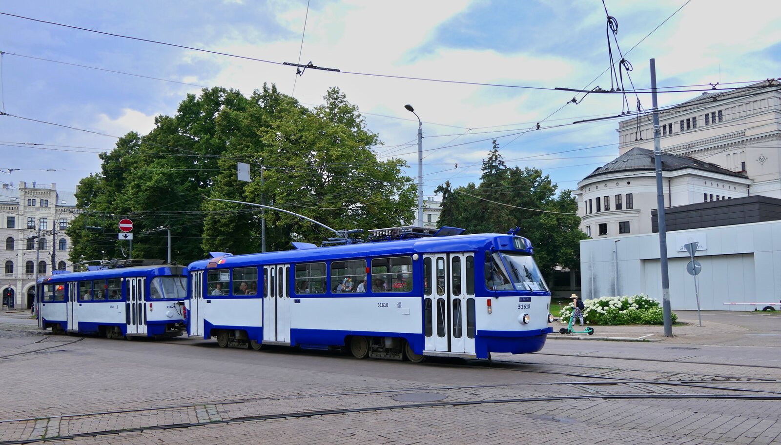 In Lettlands Hauptstadt Riga sind neben modernen Niederflurtrams noch viele Tatra-Straßenbahnen unterschiedlicher Typen im Einsatz. Einer davon sind die Fahrzeuge vom Typ Tatra T6B5, die in Riga als T3MR bezeichnet werden. Ein Gespann mit dem im Jahr 1990 gebauten Wagen 35021 konnte am 14.07.2025 am Zigfrīda Annas Meierovica Bulvāris unweit der Altstadt auf der Linie 11 zur Fahrt nach Ausekļa iela aufgenommen werden.
