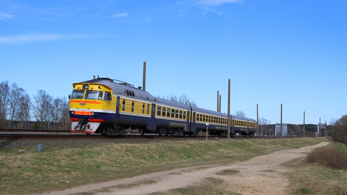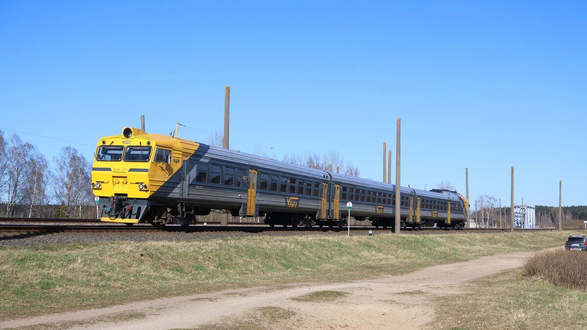 Vorortzug 837 Sigulda - Riga der AS Pasažieru Vilciens kurz nach der Überfahrt über den Fluss Jugla. Diese Leistung wurde von einer der drei modernisierten Garnituren vom Typ DR1AC erbracht. Im Gegensatz zum sowjetlettischen Fahrzeugmaterial vom Typ DR1A verfügt dieser unter anderem über eine Klimaanlage.