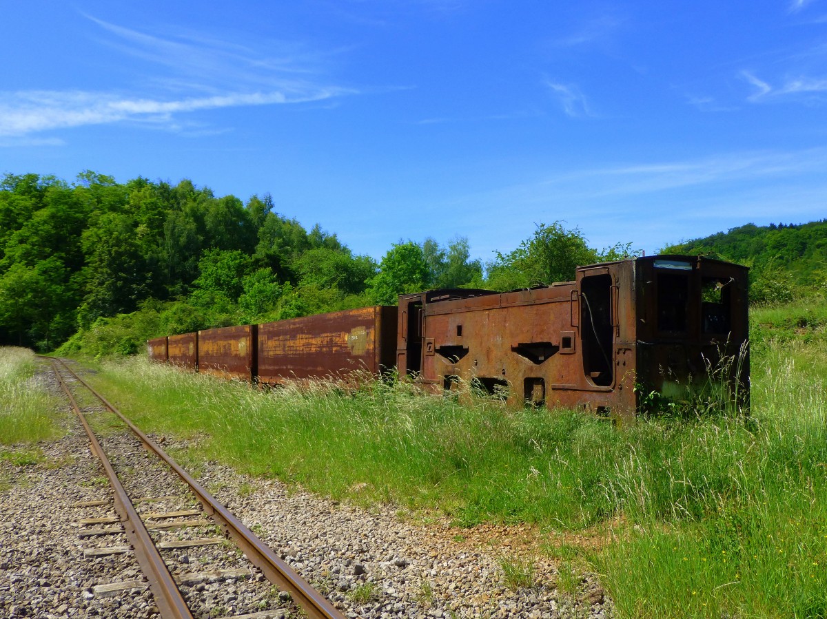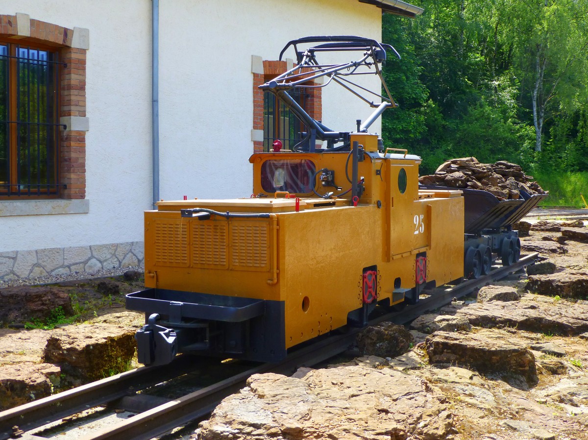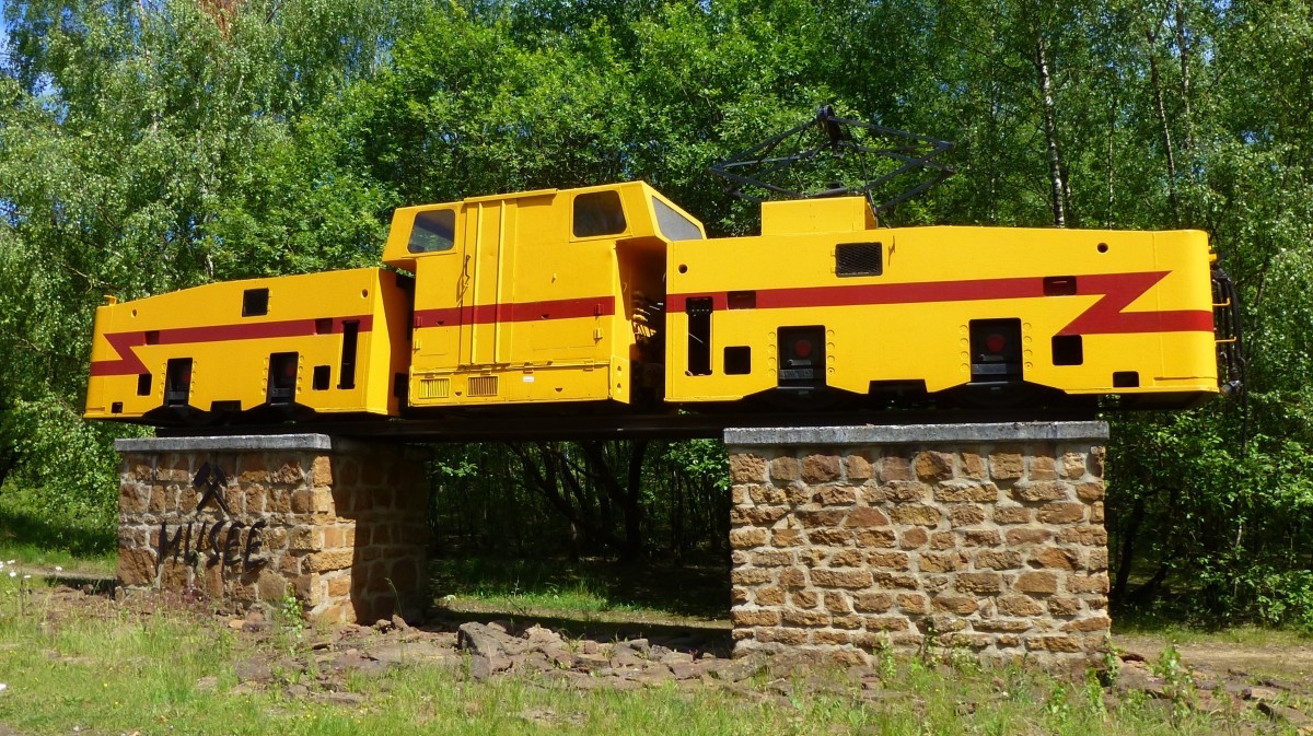 Ein Druckluftschaufellader und ein Seitenkipper für Erzgruben "Buggi" (luxemburgischer Typ) stehen als Denkmal im Bereich des Nationalen Eisengrubenmuseums in Rumelange. Im Gegensatz zu den franzöischen Kippern, welche nach zwei Seiten entleert werden konnten, ist es bei den luxemburgischen Wagen nur zu einer Seite möglich. 21.05.09 (Jeanny)