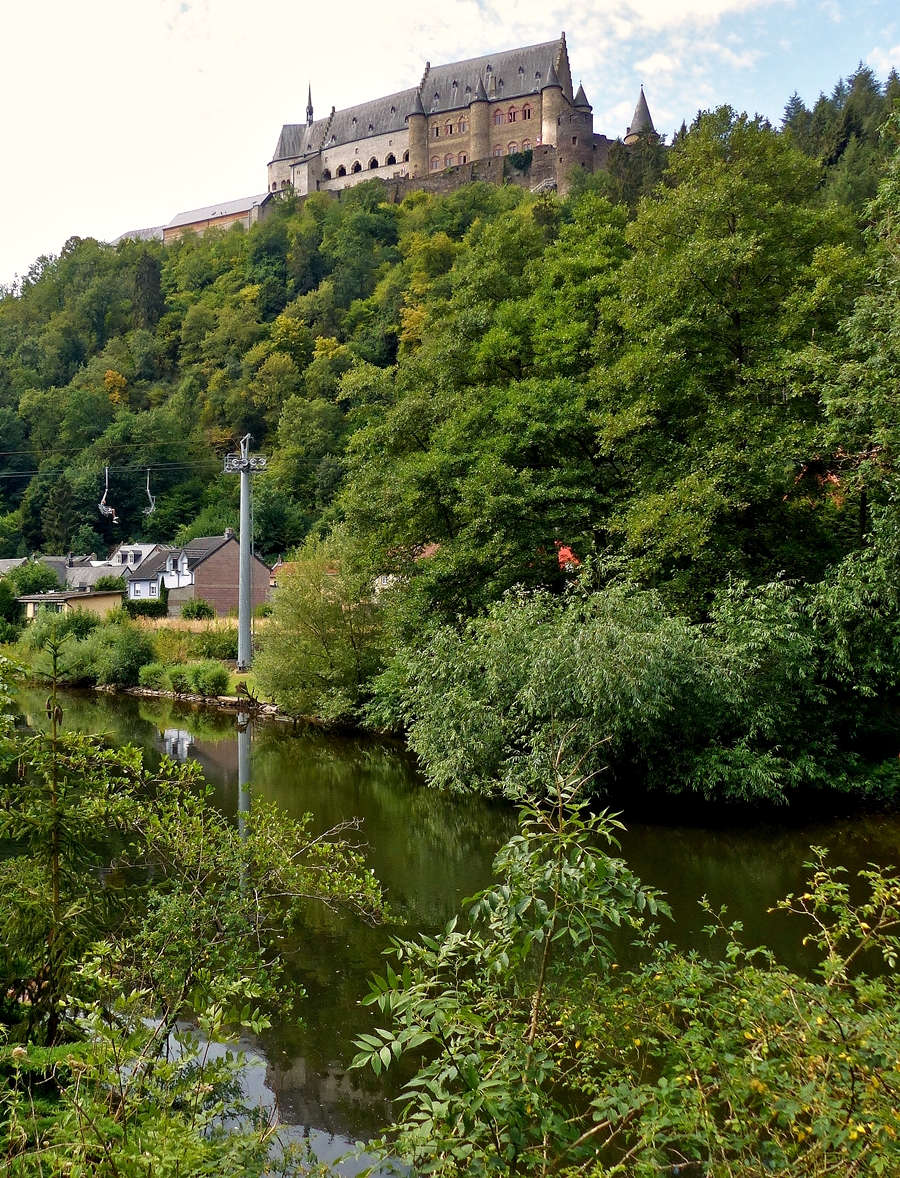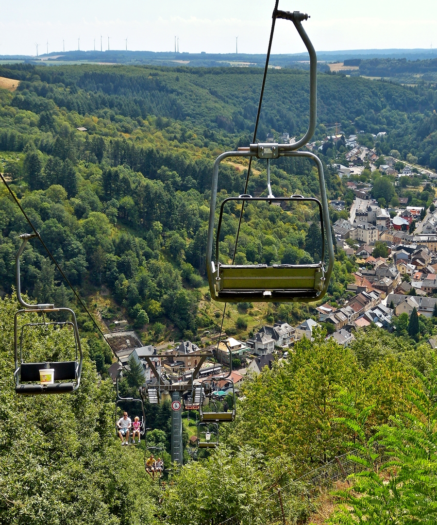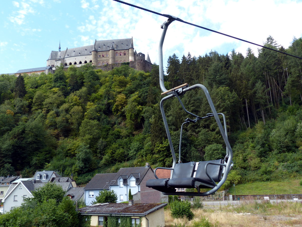 In Vianden gibt es den einzigen 1955 gebauten Sessellift Luxemburgs. Die Talstation liegt am Flüßchen Our auf 215 m ü M, während sich die Bergstation auf einer Höhe von 375 m ü M befindet. 31.07.2018 (Jeanny)