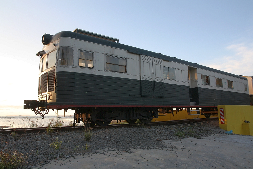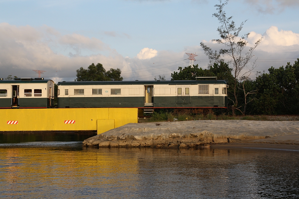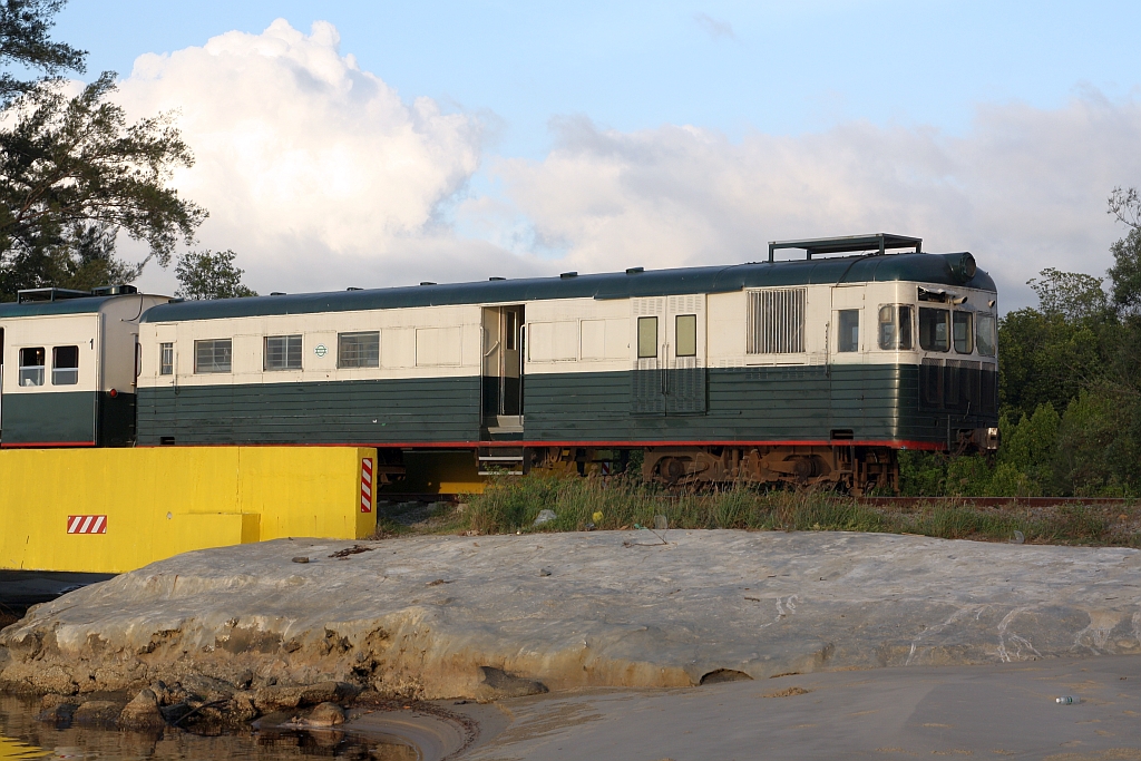 Der nur an Samstag verkehrenden Touristenzug "TRAIN TO MUARA SUNGAI BENONI" ist für Romantiker und frisch Verleibte gedacht, da das Ziel der Fahrt das Beobachten des Sonnenuntergangs ist. - Das Bild vom 15.Februar 2025 zeigt so eine romantische Stimmung mit Sonnenuntergang und der Silhouette des zum Kitchen Car umgebaute JKNS 310x (ex NBR 54, Hersteller: Wickham, Baujahr: 1956, Fabr.Nr.: 7624).