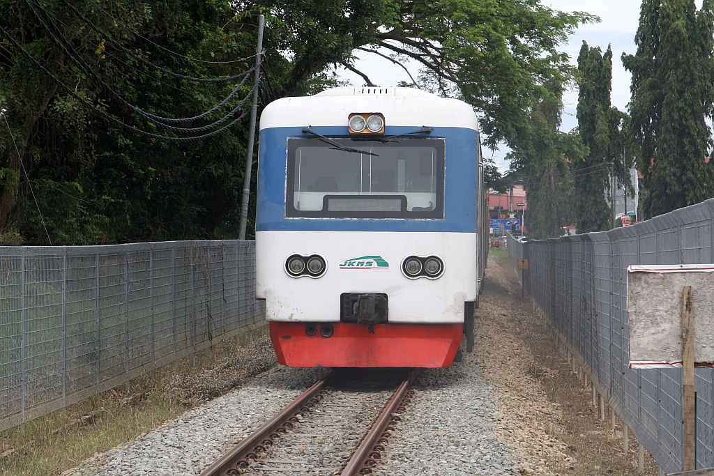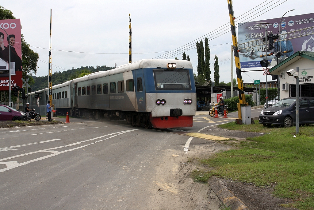 Zug PU 502 (Beaufort - Sembulan) mit dem JKNS 8901-2 als letztes Fahrzeug am 11.Februar 2025 kurz nach der EK beim Km 90,0 in Beaufort. Karl Seltenhammer