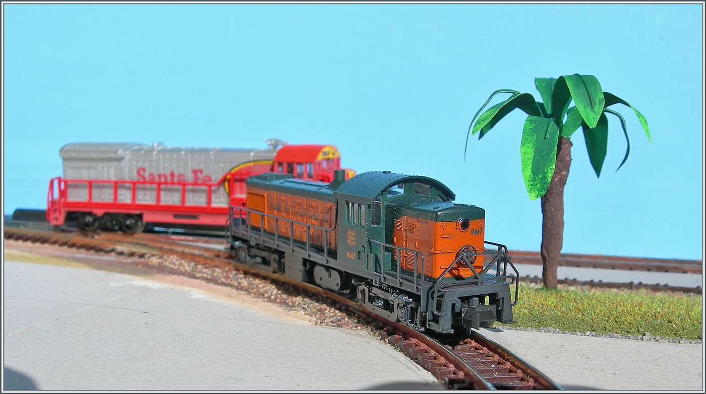 Meine U36B  Santa Fe  ATSF 353 fährt ganz anständig, doch die Fahrgeräusche nach fünfzehn Jahren Stillstand weckten doch den Gedanken, dass es nicht unmöglich sein könnte, dass die Lok mit einem Getriebeschaden auf der Strecke liegen bleiben könnte. Dann hätte ich eine passende Anlage, aber keine Lok mehr. Damit dieser Fall möglichst nicht eintritt, eilte aus dem hohen Norden die New Haven (NH) ALCO RS1 0667 zu Hilfe und unterstützt nun die Santa Fee N° 353.