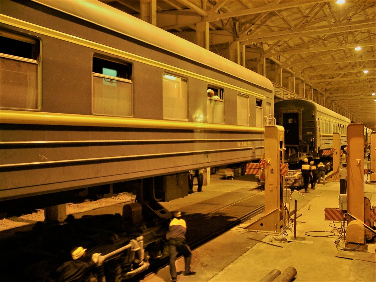 Bahnhof Erlian (Erenhot),Umspur-und Grenzstation zur Mongolei.Eine mongolische 2M62 kuppelt sich an einen russischen Zug den sie via Ulan Bator nach Ulan Ude, Russland, ziehen wird.28.5.2010