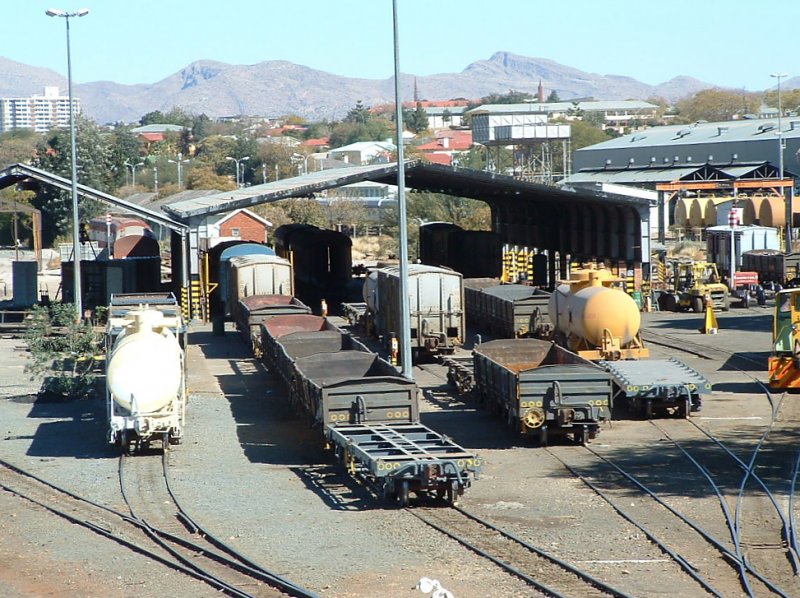 Von der Strassenbrücke aus hat man direkten Blick auf die Wagenreparatur-Werkstätte im Depot Windhoek. Es werden nicht nur Reparaturen ausgeführt, sondern auch Umbauten erledigt. Auf dem Bild zu erkennen zB. die Kesselwagen, die aus revidierten Untergestellen und neuen, aus China stammenden Kesselaufbauten zusammengestellt wurden (die gelben Kessel, für Säuretransporte). März 2006. Beat H. Schweizer