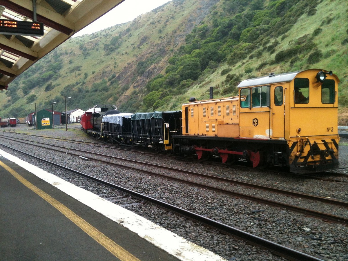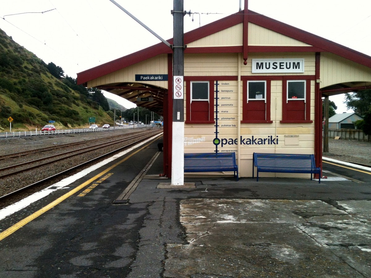 Hier fährt gerade ein moderner Elektrotriebwagen in den Bhf. von Peakakariki (Wellington / Neuseeland) ein.