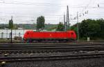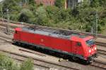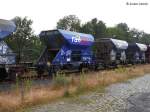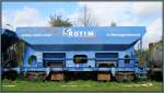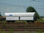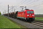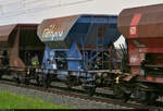 Blick auf einen niederländischen offenen Schüttgutwagen mit dosierbarer Schwerkraftentladung der Gattung "Fccpps" (23 84 6437 994-6 NL-RP), der in einem Schotterzug mit 185 210-2 in Braschwitz Richtung Halle (Saale) fährt.