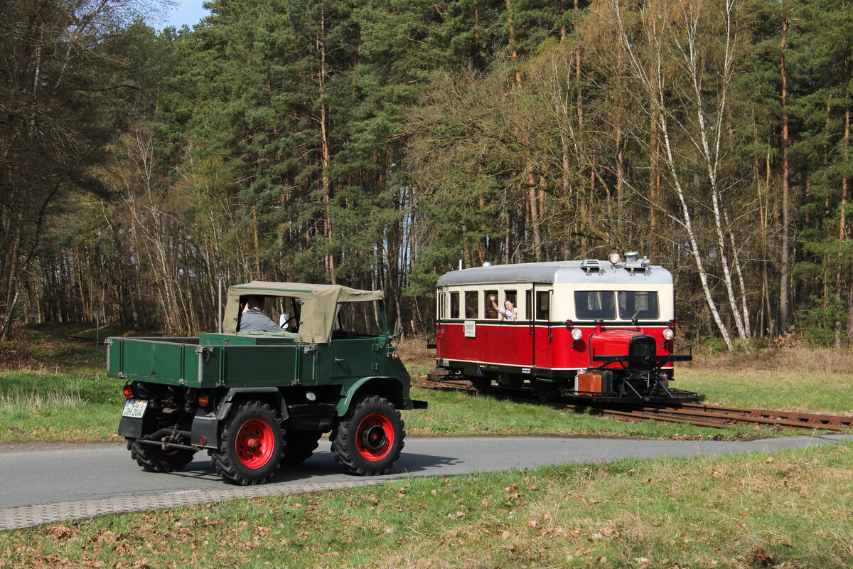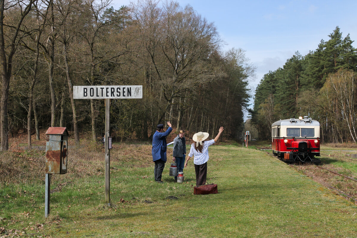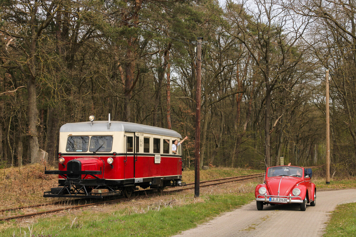 Schienenbus Nr. 25 der MBS, ehemals Kleinbahn Delmenhorst-Harpstedt, überquert den Bahnübergang Lansinkweg (24.04.2022)