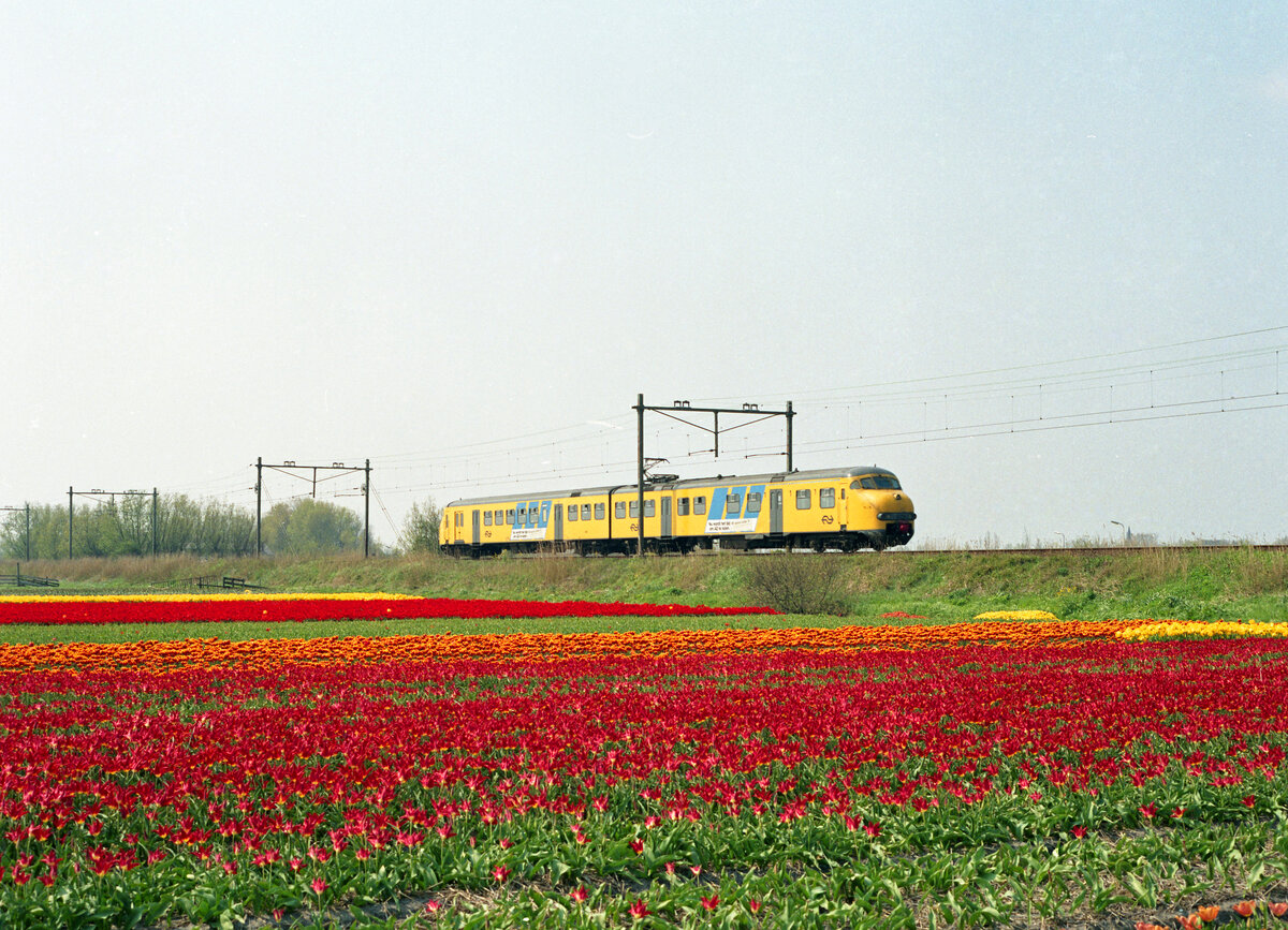 NS 20 wartet am Behelfsbahnsteig Lisse Keukenhof. NS 838 kommt vorbei als IC-5547 von Hoorn nach Den Haag CS. Lisse, 22.04.1990, Scan 95238.