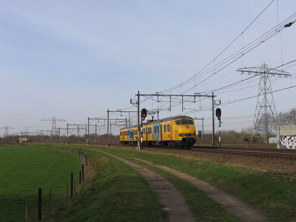 NS 20 wartet am Behelfsbahnsteig Lisse Keukenhof. NS 838 kommt vorbei als IC-5547 von Hoorn nach Den Haag CS. Lisse, 22.04.1990, Scan 95238.