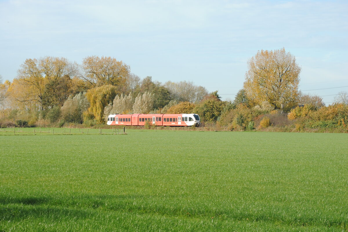 Arriva nr 367 am Bahnsteig als Zug 30936 (Winterswijk - Arnhem Centraal). Die 5048 und 5049 (Breng) verbleiben am Wochenende hier in der Abstellanlage. Doetinchem, 01.12.2024. Blick vom Parkplatz, über den Zaun. Bild 23291.