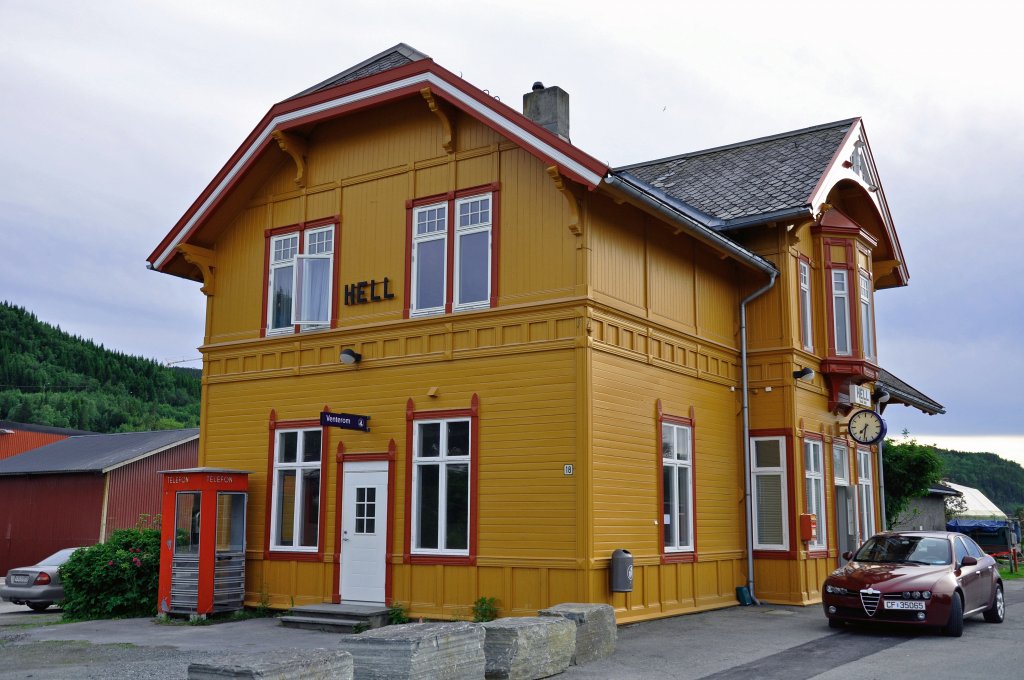Gebäude der historischen Güter- und Gepäckabfertigung von Hell (Norwegen) ca. 32 km östlich von Trondheim. Der Running-Gag ist natürlich die englische freie Übersetzung des Schildes. Aufnahme vom 02.07.2010.