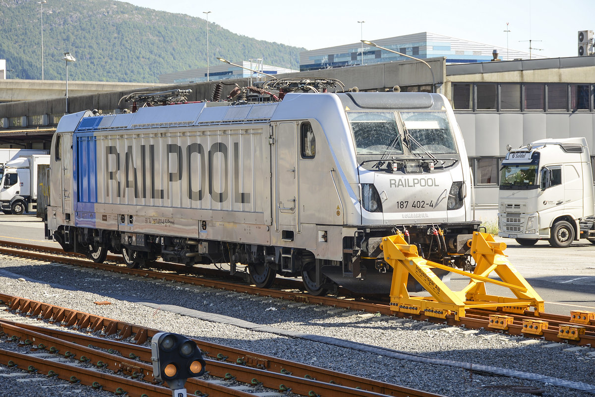 Lok 187 400 ist mit einem Güterzug in Myrdal auf das hintere Gleis eingefahren und wartet für die Weiterfahrt ostwärts die Kreuzung oder Überholung eines Reisezuges ab. Myrdal, 31.8.2024