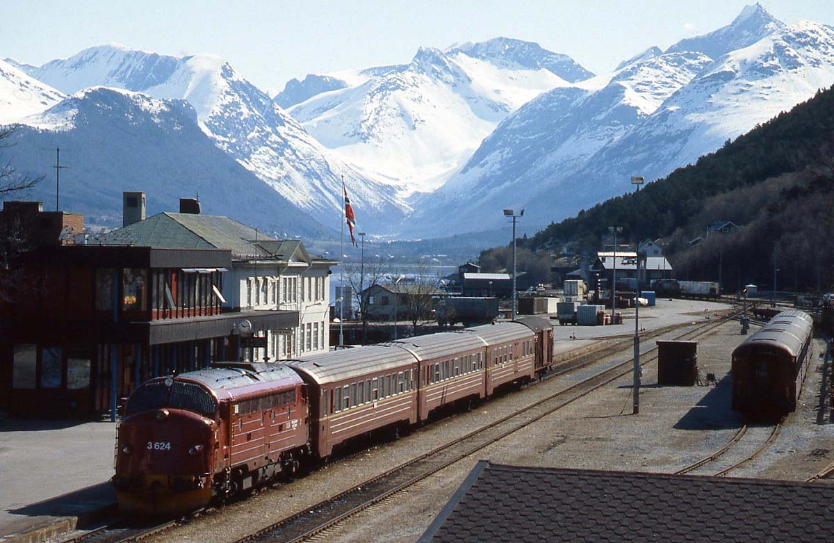 Spezieller Reisezugwagen im Bahnhof Andalsnes: Intercity Spesial Topgkapellet Zugkapelle. Im Innern befindet sich eine kleine Kapelle mit 'Eisenbahnmobiliar'. Andalsnes, 27.8.2024
