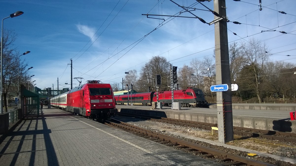 101 073-5 stand am 15.02.2014 mit IC 1218 nach Frankfurt am Main Hbf in Bregenz Bahnhof