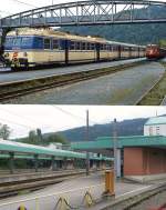 Bahnhof Bregenz im Winter: Begegnung unterschiedlicher österreichischer Schienenschönheiten, ÖBB 6030.318 und ÖBB 1020.33 Datum: 16.02.1985